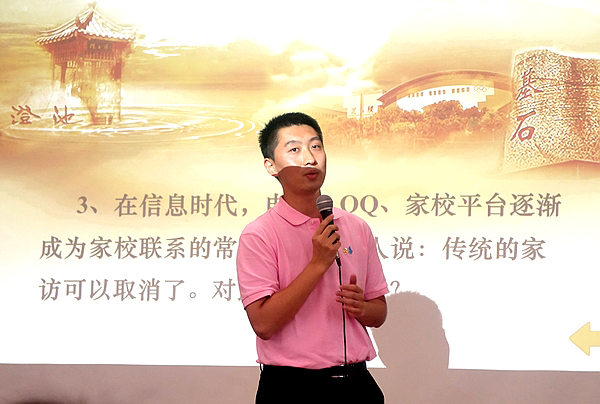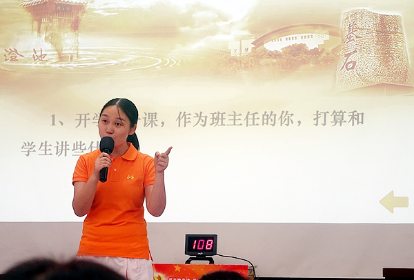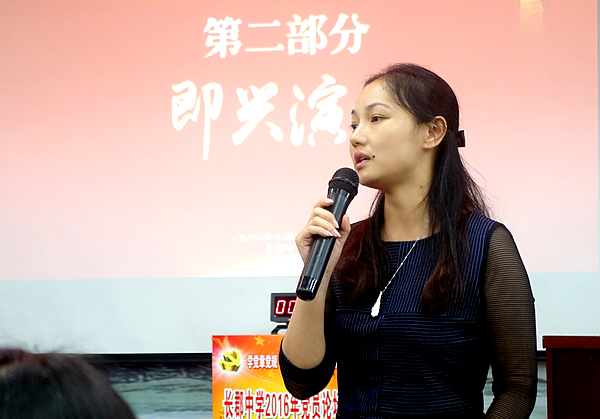 刘蓉芳、何立军、于鹏飞、杨葵4位选手代表各代表队进行了即兴演讲。在现场抽题之后,仅仅准备2分钟,他们分别就“开学第一课讲什么”、“QQ、微信能否取代家访”、“怎样理解教育的爱与责任”、“如何看待中学生穿校服不利于学生个性发展”等四个问题阐述了自己的观点。在随后的现场采访中,长郡双语实验中学党委向星书记说,四位选手的演讲主题突出、思路清晰、表达准确精炼,体现了老师对教育的理解、对责任的思考、对工作的反思,特别是老师能恰到好处地把刚刚结束的奥运故事作为教育素材,体现了老师们的用心和教育智慧。向书记希望全体党员牢记习总书记的七一讲话中“全党要关注青年、关心青年、关爱青年,倾听青年心声,做青年朋友的知心人、青年工作的热心人、青年的引路人”的要求,用心、用情、用智慧做教育,完成好立德树人的教育使命。