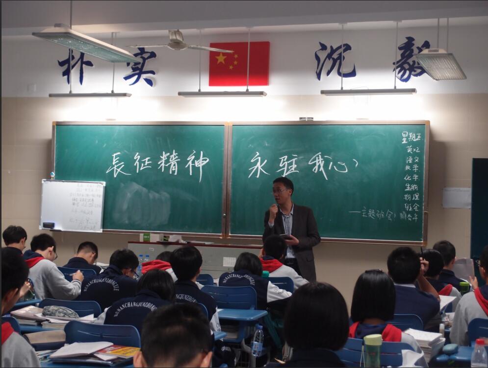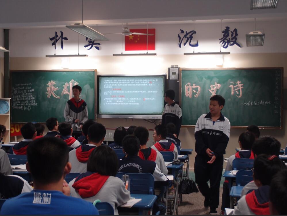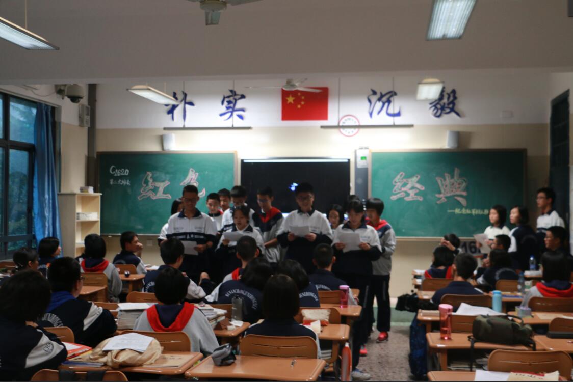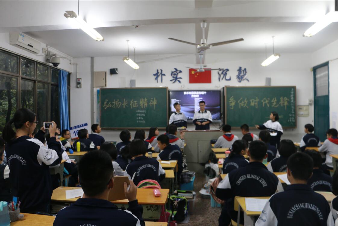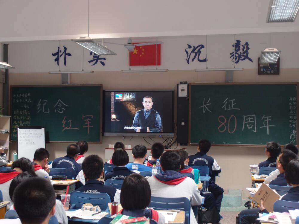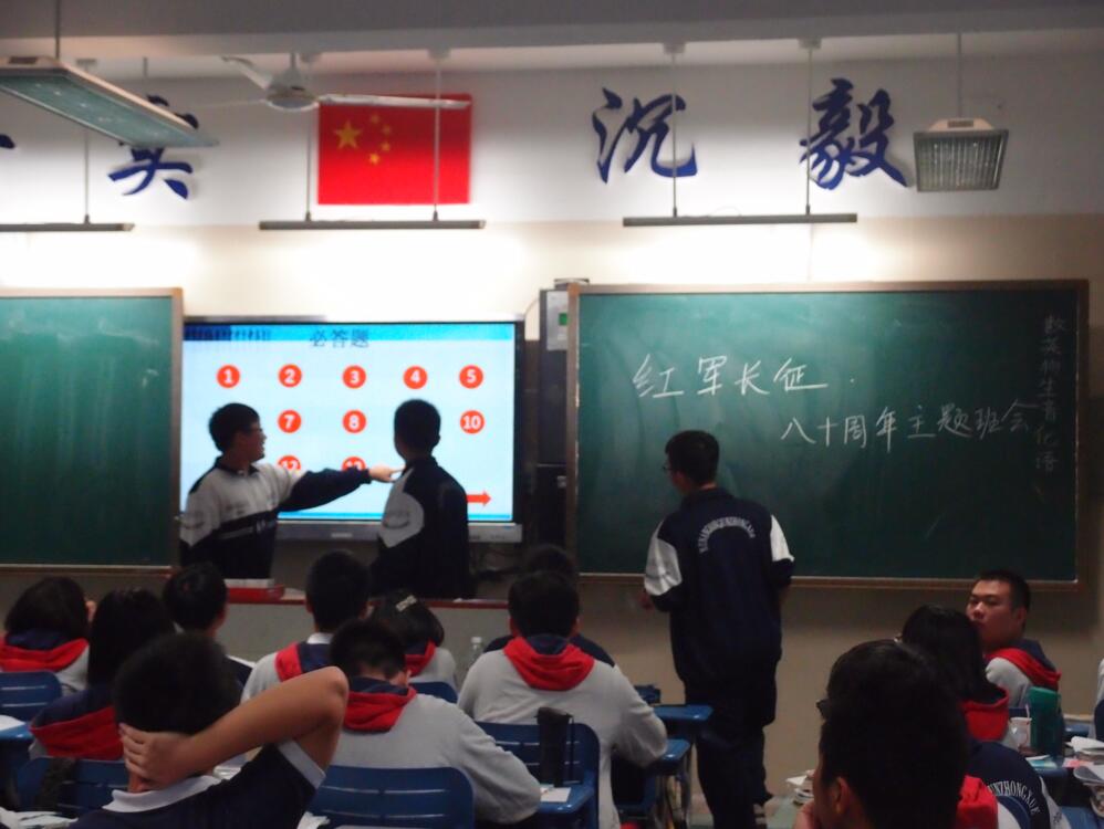 九月的最后一个星期五,高一高二的同学们开展了纪念长征胜利80周年的主题班会活动。期间活动形式丰富多彩,有的邀请老师来讲述漫漫长征路的故事,有的观看长征纪念视频拓宽视野,有的以诗朗诵的形式使班会气氛激昂,有的则通过唱红歌的形式,有的采取知识抢答加分制的方法……