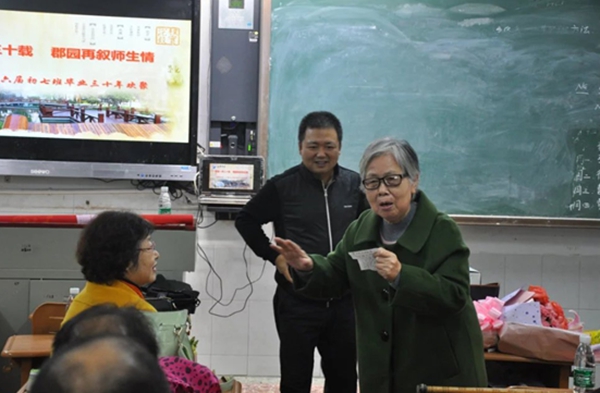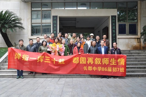 2016年11月19日上午,长郡中学86届初7班的26位同学齐聚郡园,邀请了廖玲芳老师夫妇,刘爱军老师,罗巧奇老师,在长郡中学教室里举行了题为“弹指一挥三十载,郡园再叙师生情”的主题班会,师生欢聚一堂,大家踊跃发言,三十年前的点滴轶事信手沾来,友情在欢笑中越来越浓烈;同学们用自己三十载的人生经历感叹,师恩在回忆中越发深重。廖玲芳老师在班会中赋诗一首: