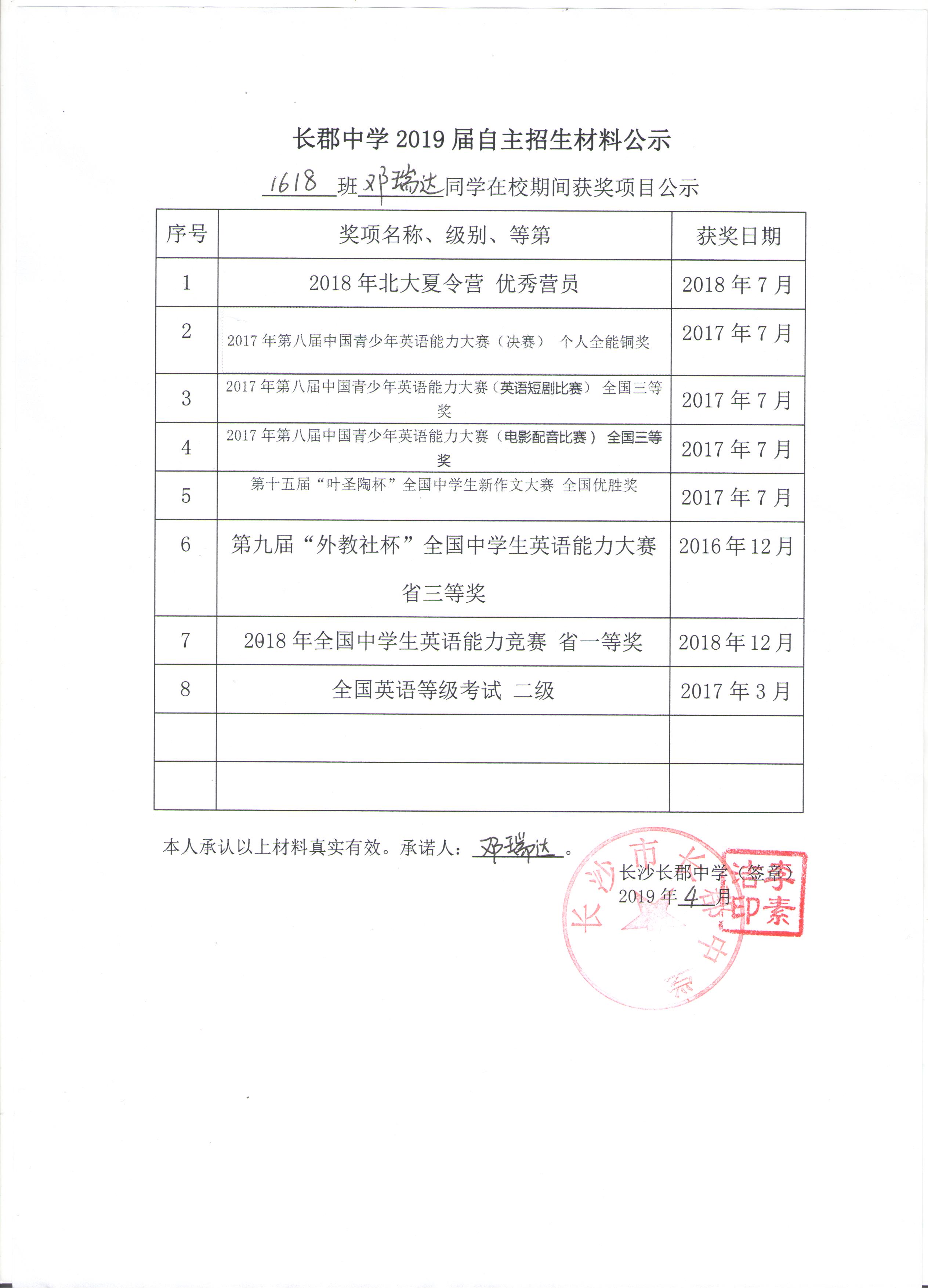 1618班邓瑞达同学自招材料网络公示