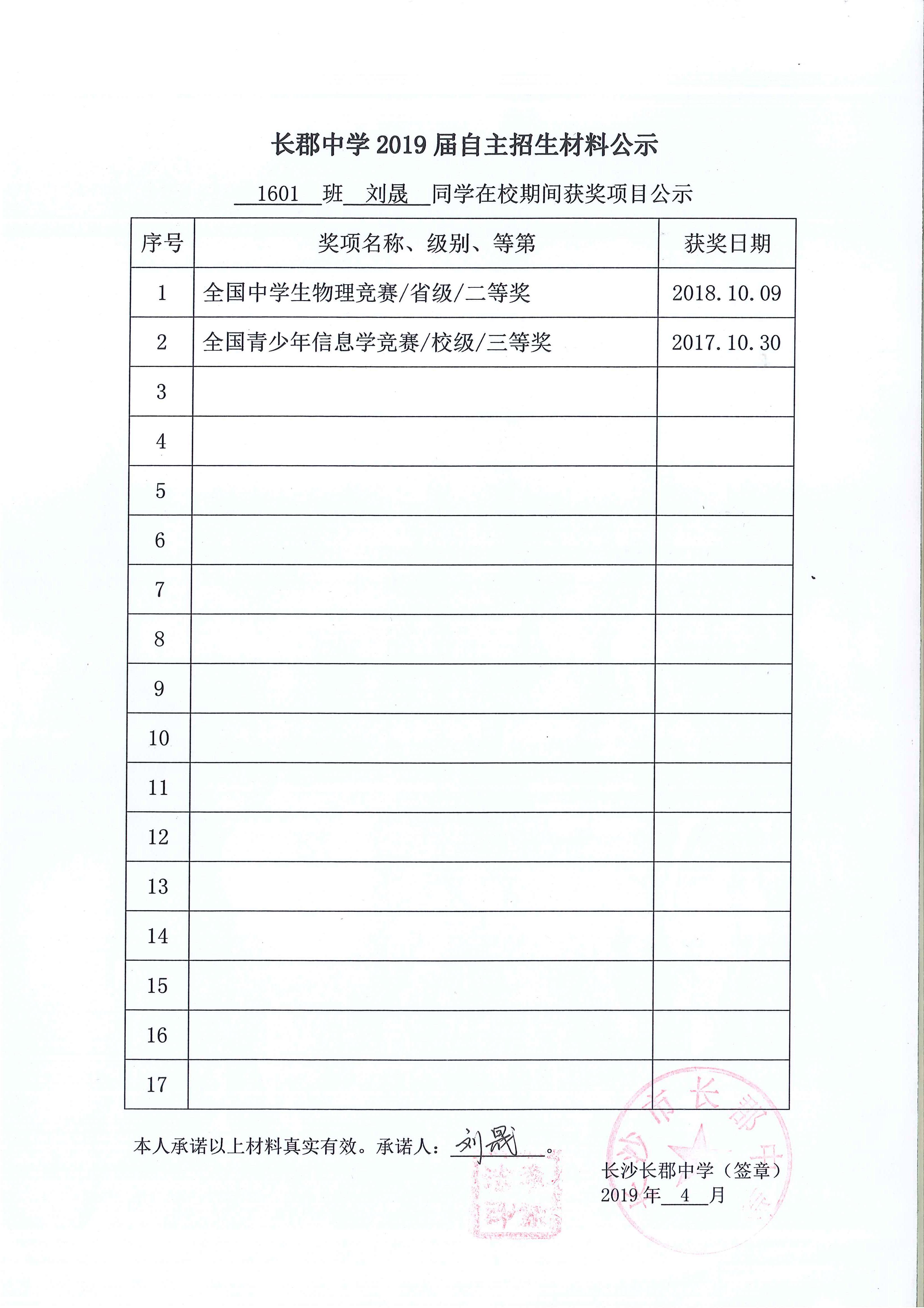 1601班刘晟同学自招材料网络公示