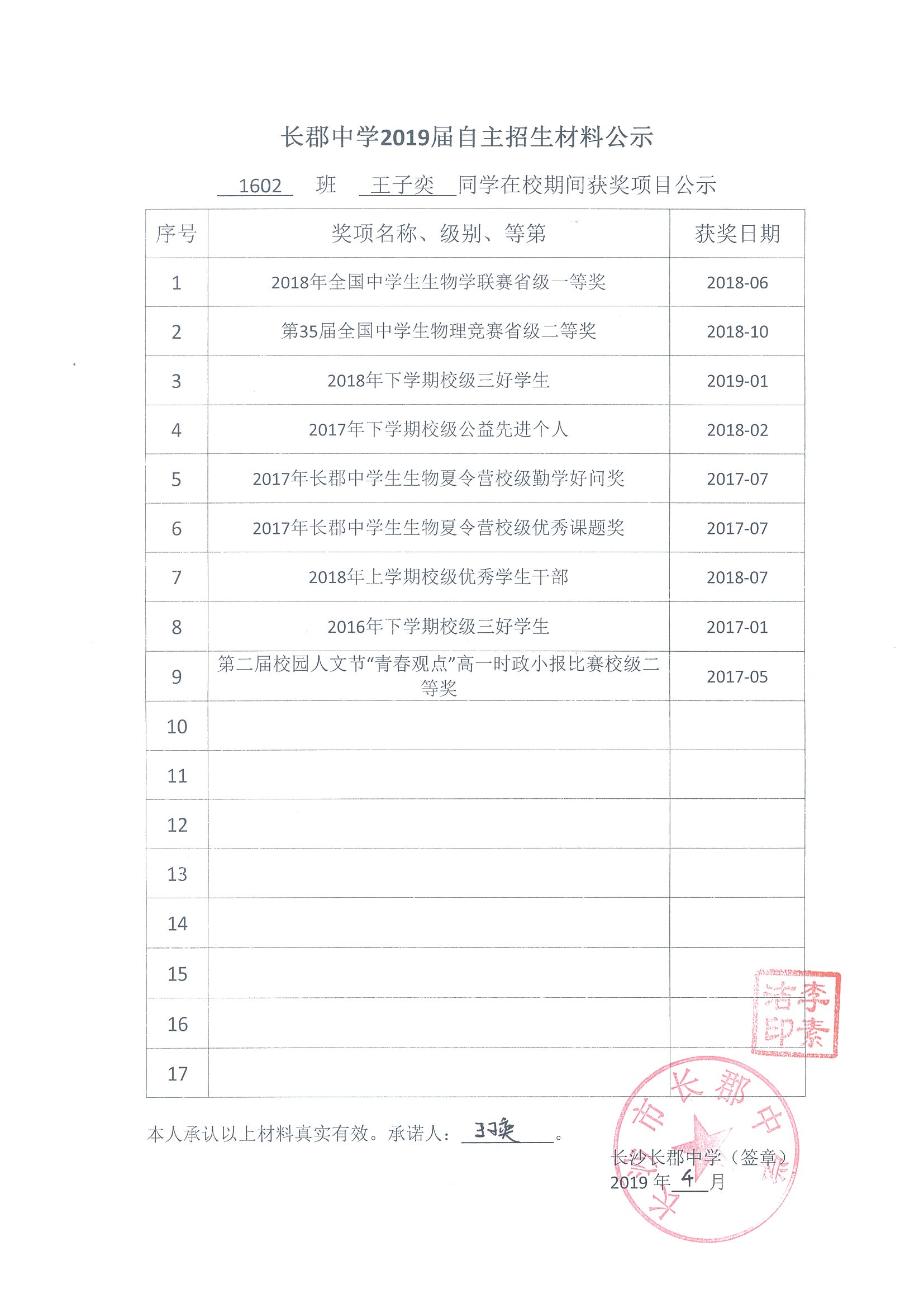 1602班王子奕自主招生网络公示