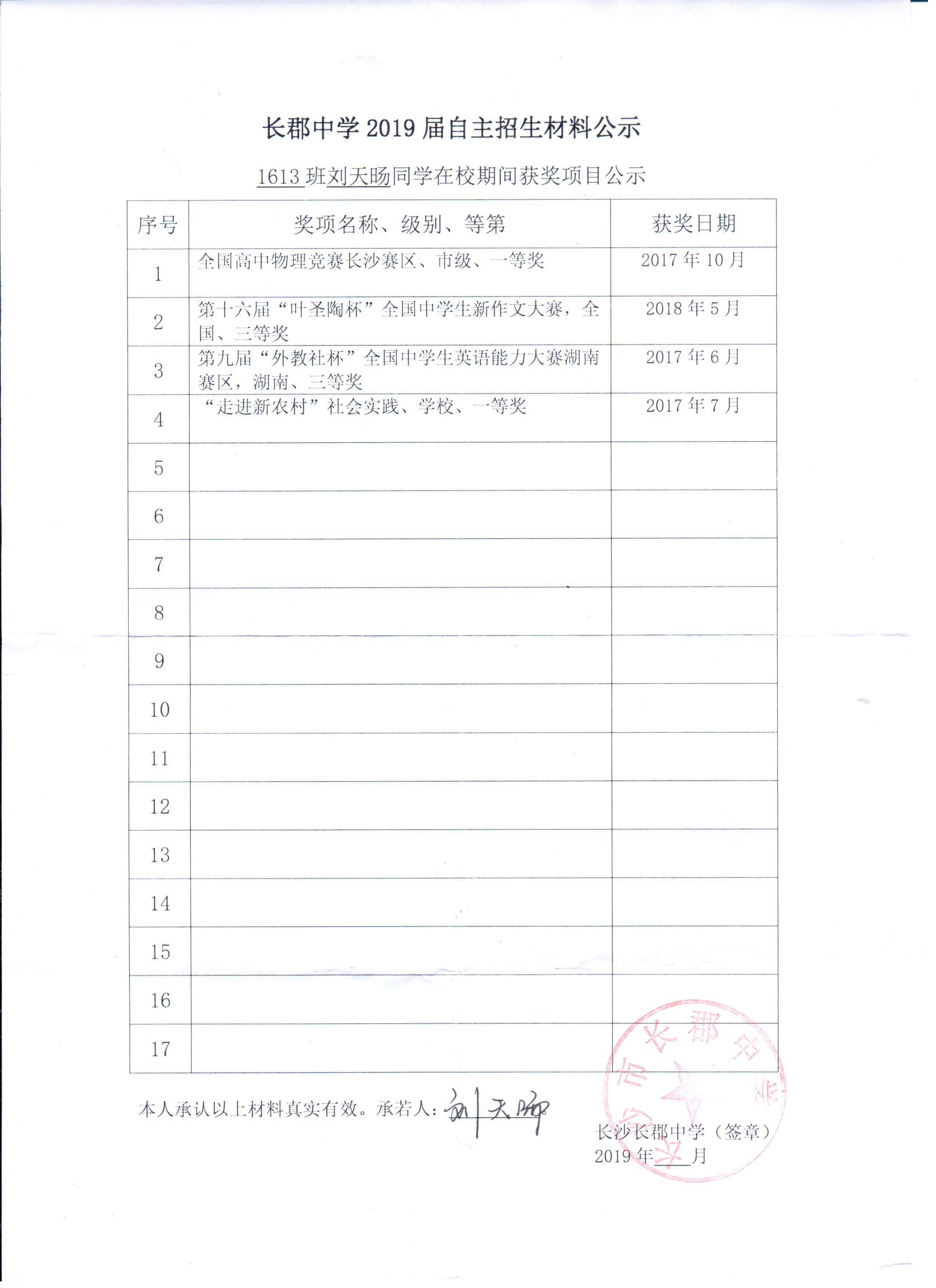 1613班刘天旸同学自招材料网络公示