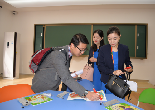 来访嘉宾漫步于美丽的校园,对我校一流的硬件设施,赞不绝口,不时拿出手机拍照,特别是在英语有声阅读室,Mr.Quang Le副校长拿起点读笔,边听音频边阅读,高度肯定了这一先进阅读方式。